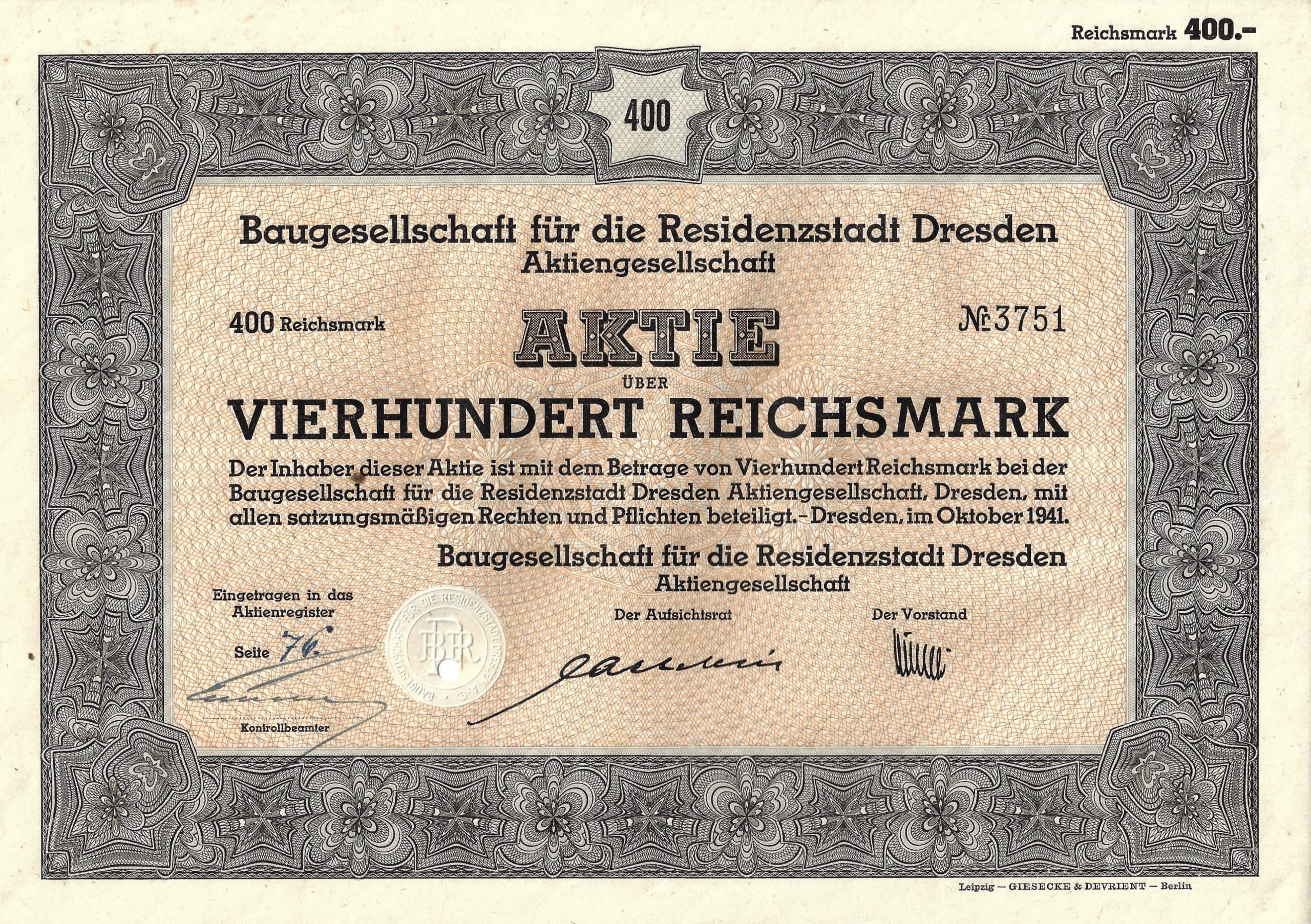 Der Firmenname lautete bis 15.8.1935: Baubank für die Residenzstadt Dresden.