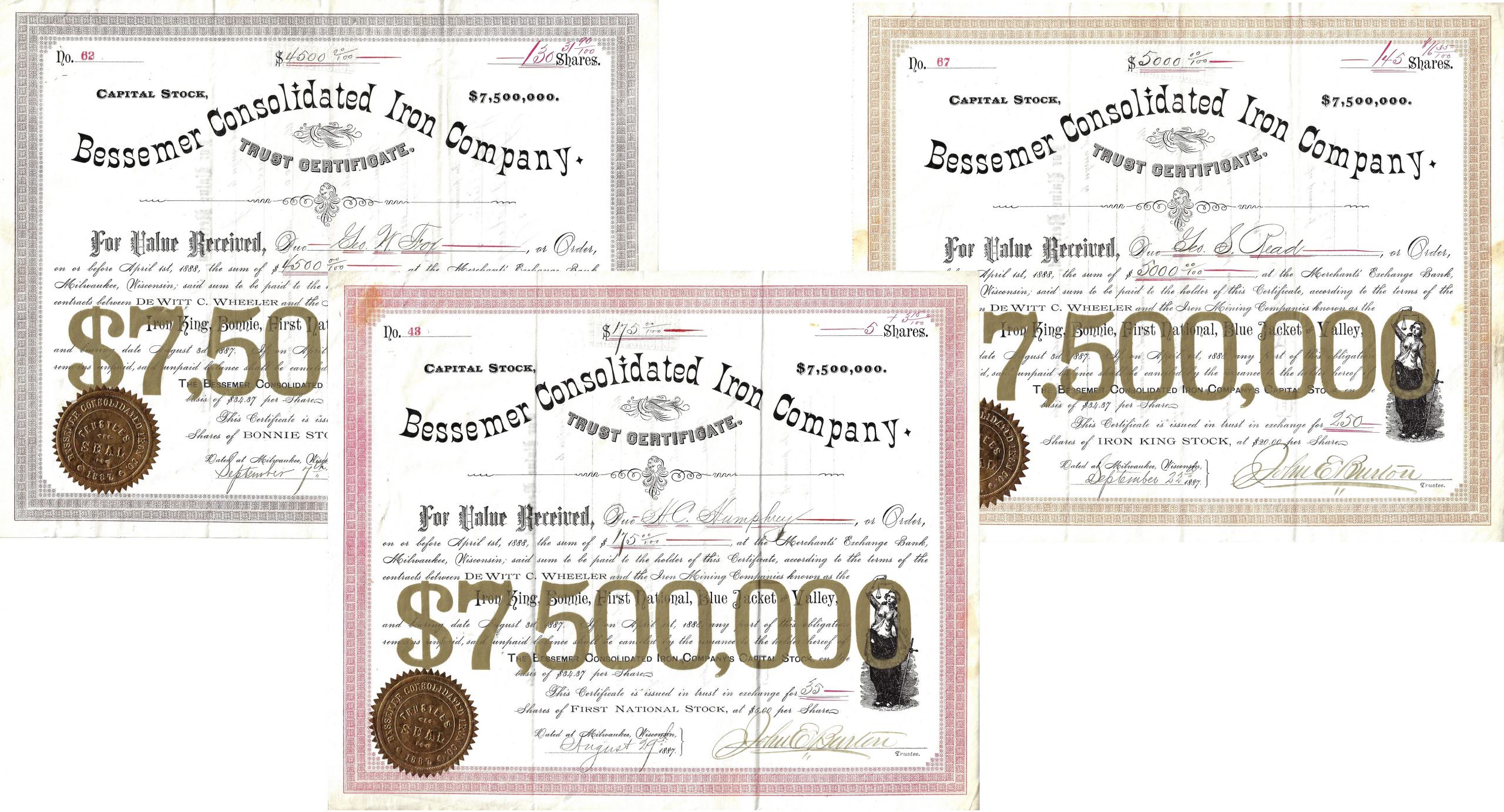 Im Juni 1888 gründete Burton mit einem Kapital von 7,5 Mio. $ die Bessemer Consolidated Iron Co. zur Übernahme seiner 5 Eisenerz-Minen im Gogebic County (bekannt als die “Burton properties”), der ehemalige US-Senator Stephen W. Dorsey wurde als Präsident gewonnen. Die Firma gab 15 Frachtdampfer in Auftrag für den Transport von jährlich 800.000 t Eisenerz von Ashland, Wisonsin am Lake Superior zu den Stahlwerken in Cleveland.
