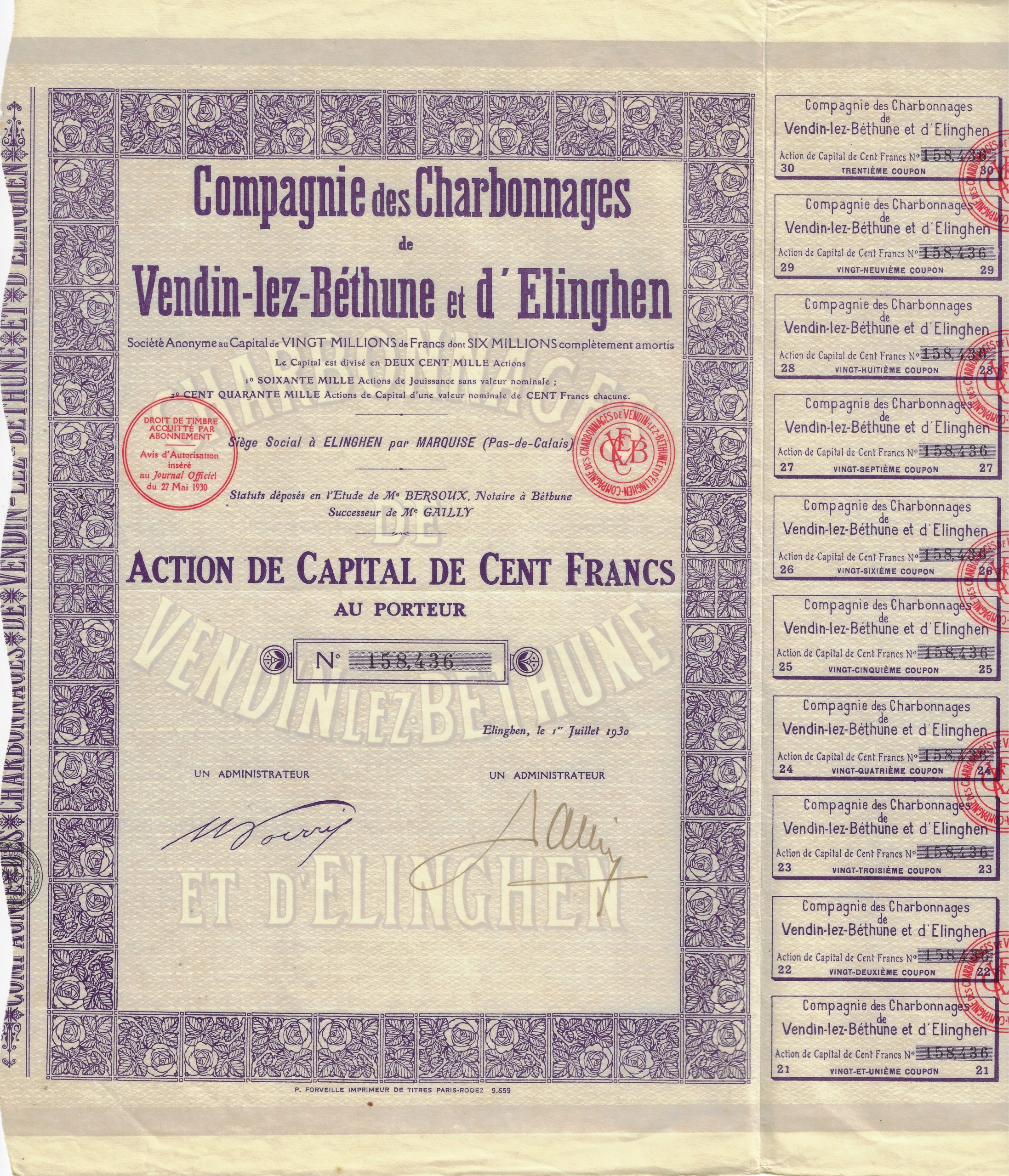 Das Unternehmen grub zwei Schächte in der Gegend von Vendin-lès-Béthune, und die Grube nahm 1913 die Produktion auf. Während des Ersten Weltkriegs beteiligte sich das Unternehmen an den Kriegsanstrengungen und verzehnfachte mit Hilfe von Bergleuten aus den besetzten Konzessionen seine Produktion. Die Fördertürme wurden 1918 bombardiert, und anschließend wurden die unterirdischen Anlagen geflutet, weil das Kraftwerk Chocques bombardiert worden war.