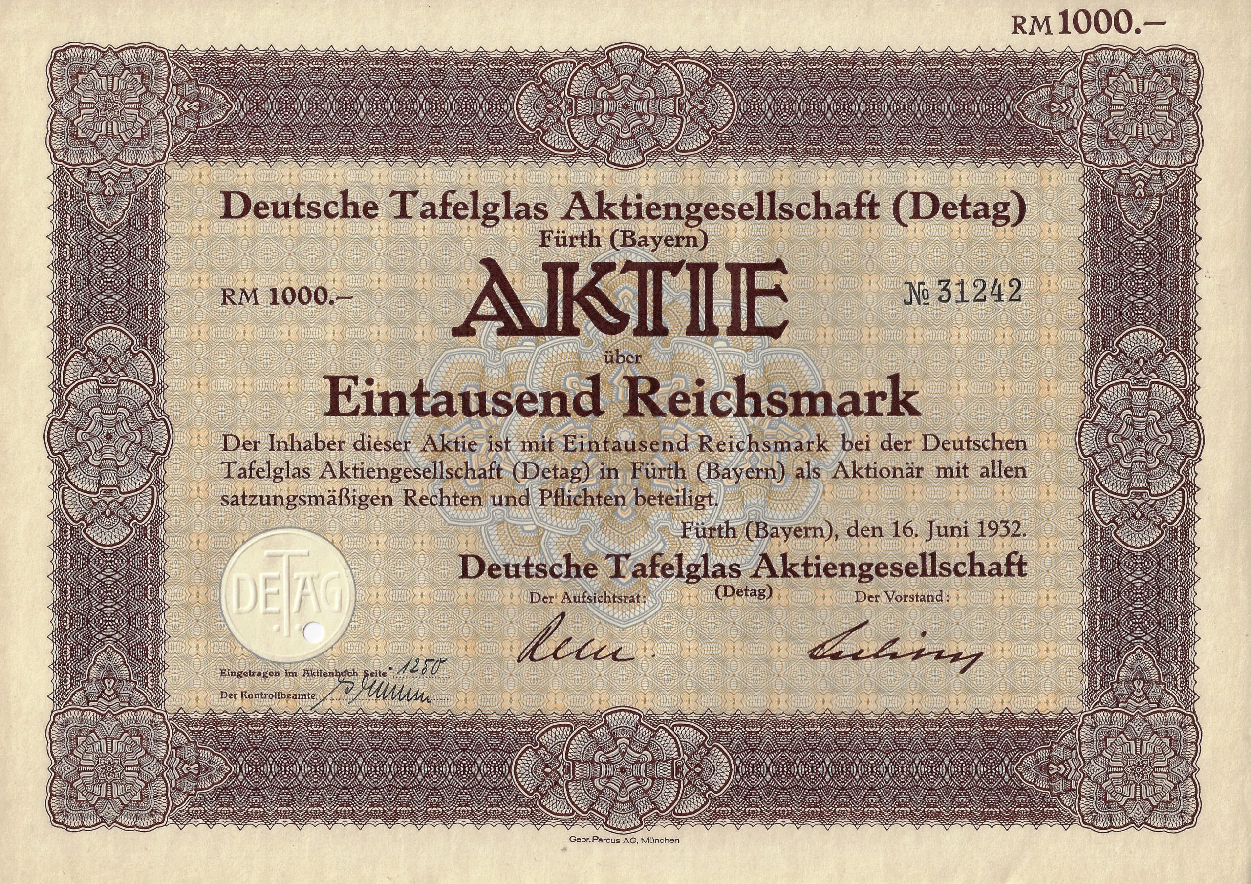 Gründung 1899 unter Übernahme der Glasfabrik Weiden AG vorm. Ed. Kupfer, noch im gleichen Jahr Umfirmierung in “Tafel-, Salin- und Spiegelglasfabriken AG”, Fürth (Bay.), später Deutsche Tafelglas Aktiengesellschaft (Detag).