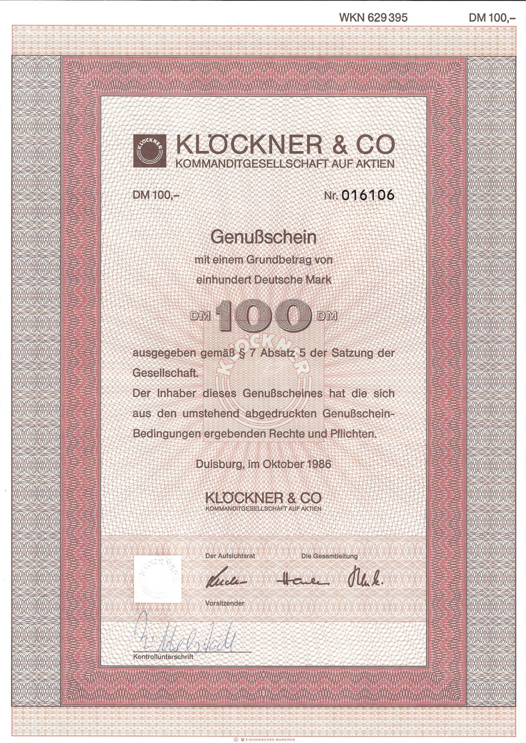 Klöckner & Co Kommanditgesellschaft auf Aktien, Genußschein, 100 DM, 1986
