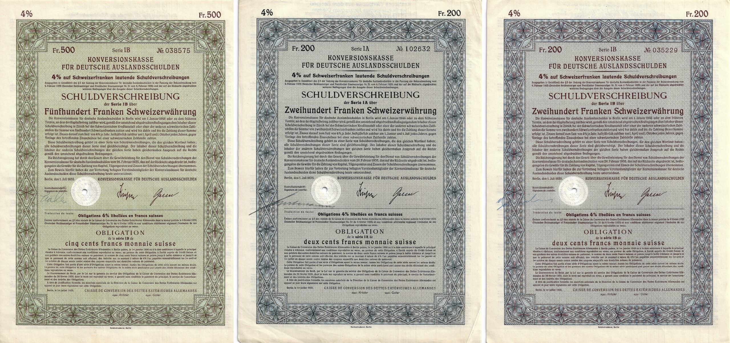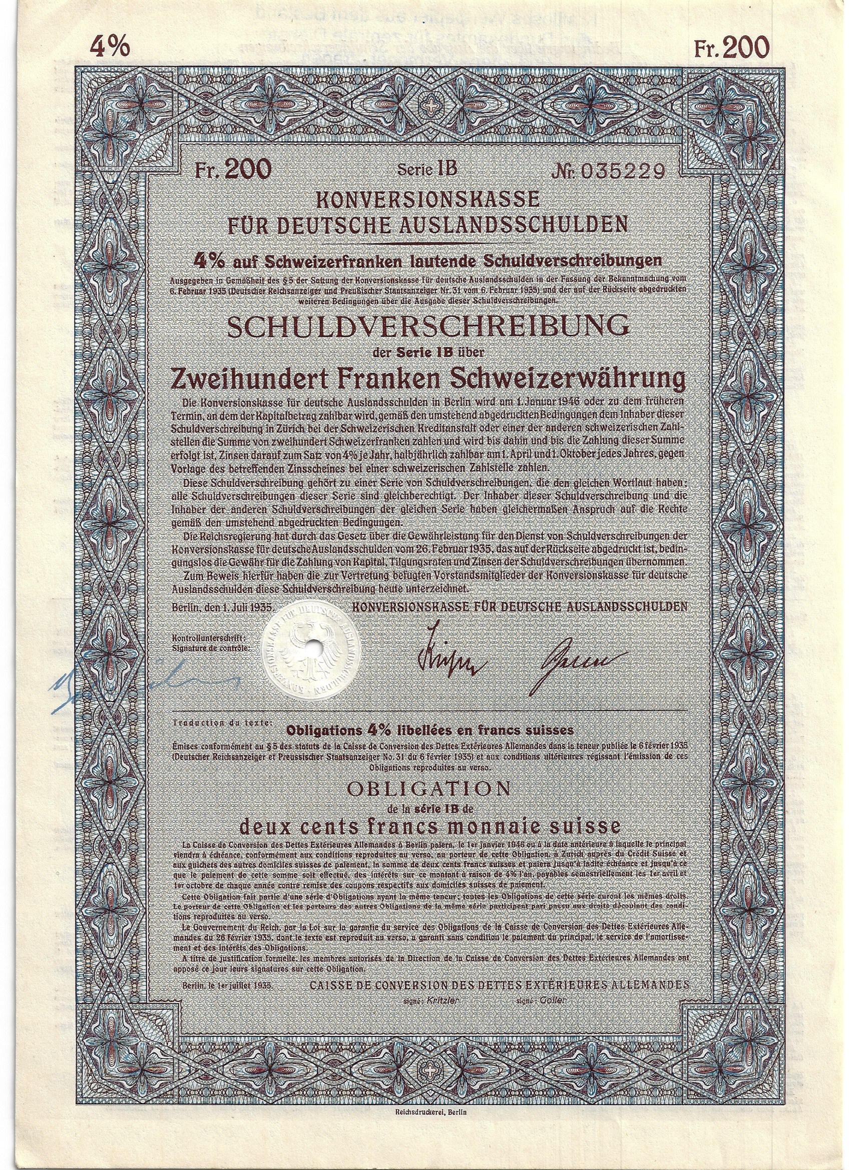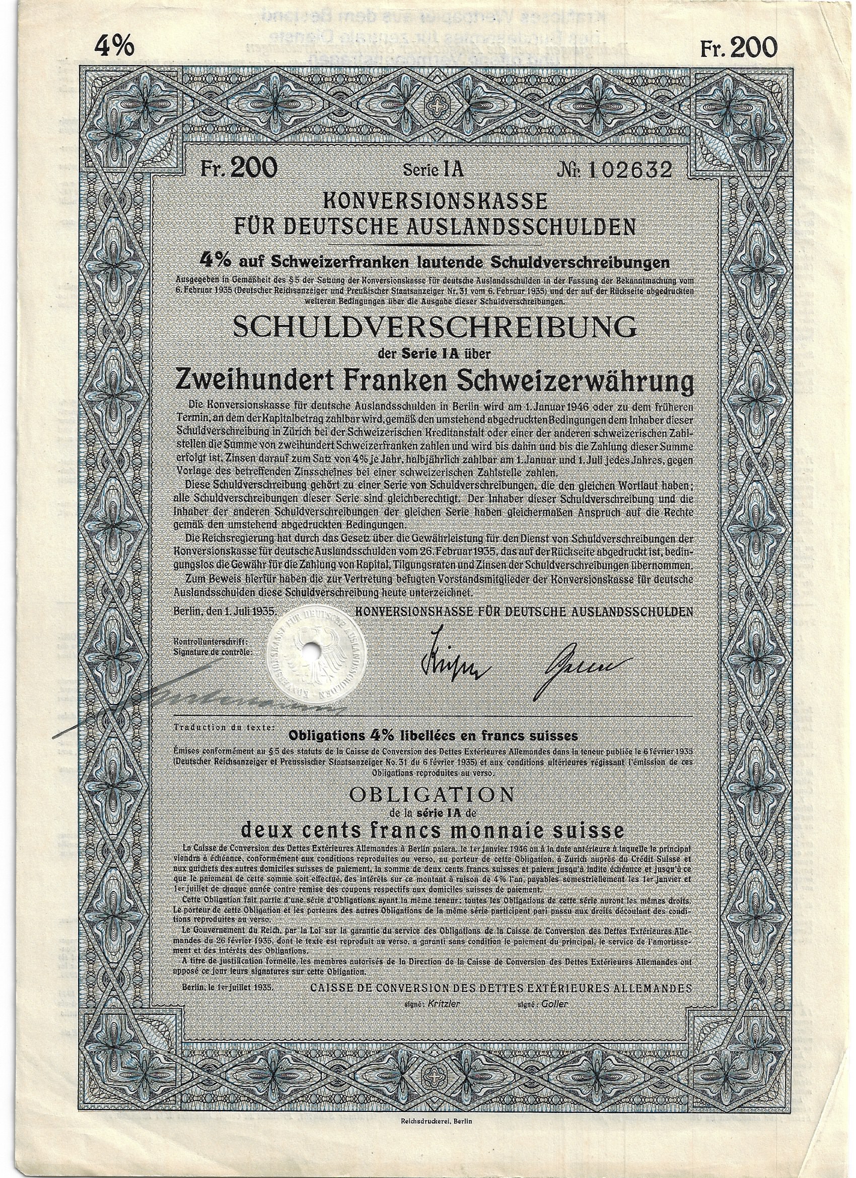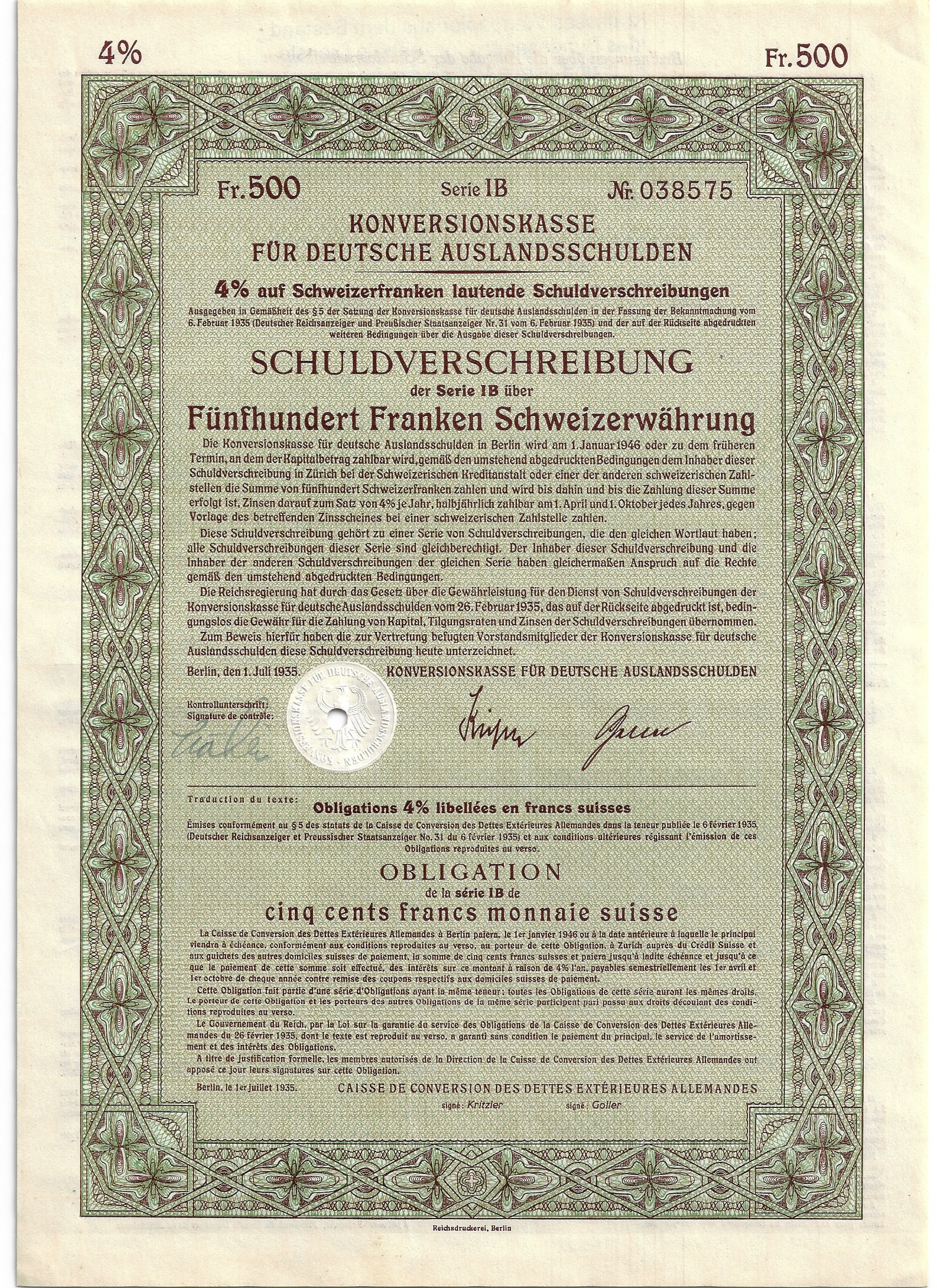 1933 wurde der Transfer der deutschen Auslandsschulden per Reichsgesetz unter Aufsicht der Reichsbank gestellt. Alle Zins- und Tilgungsbeträge auf ausländische Vermögensanlagen in Deutschland mussten über die »Konversionskasse für deutsche Auslandsschulden« abgewickelt werden.