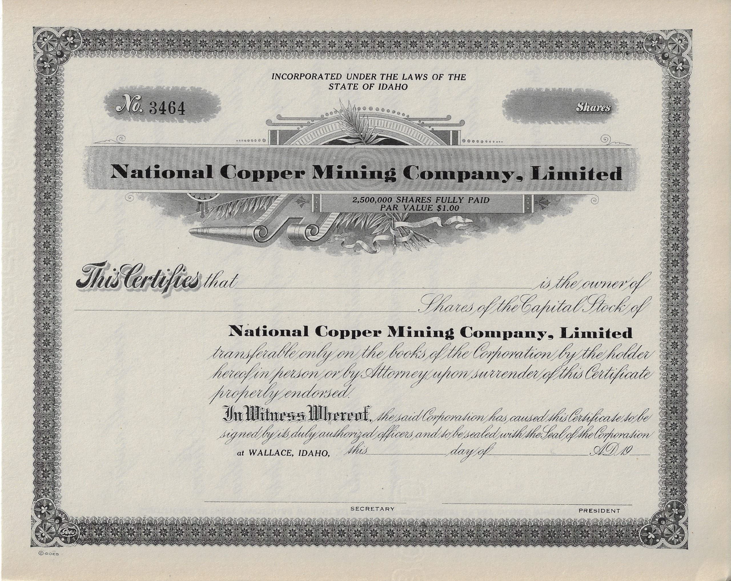 Die National Copper Mining Company wurde 1906 im Hunter Mining District, Shoshone County, Idaho, gegründet.