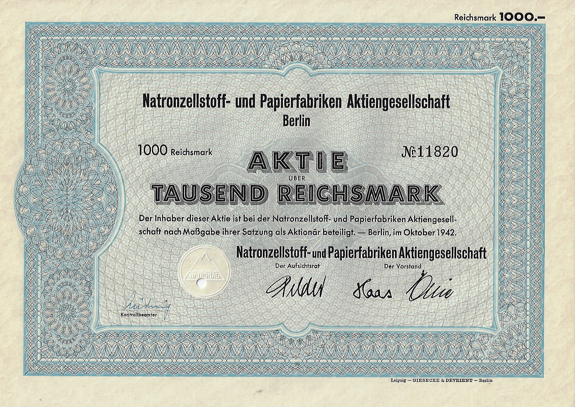 1918 umfirmiert i Natronzellstoff- und Papierfabriken AG Berlin anläßlich der Übernahme der Altdamm-Stahlhammer Holzstoff- und Papierfabrik AG.