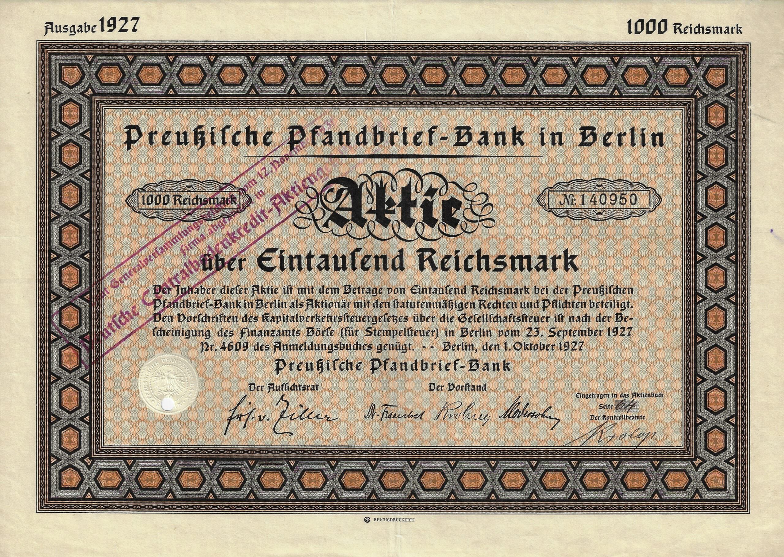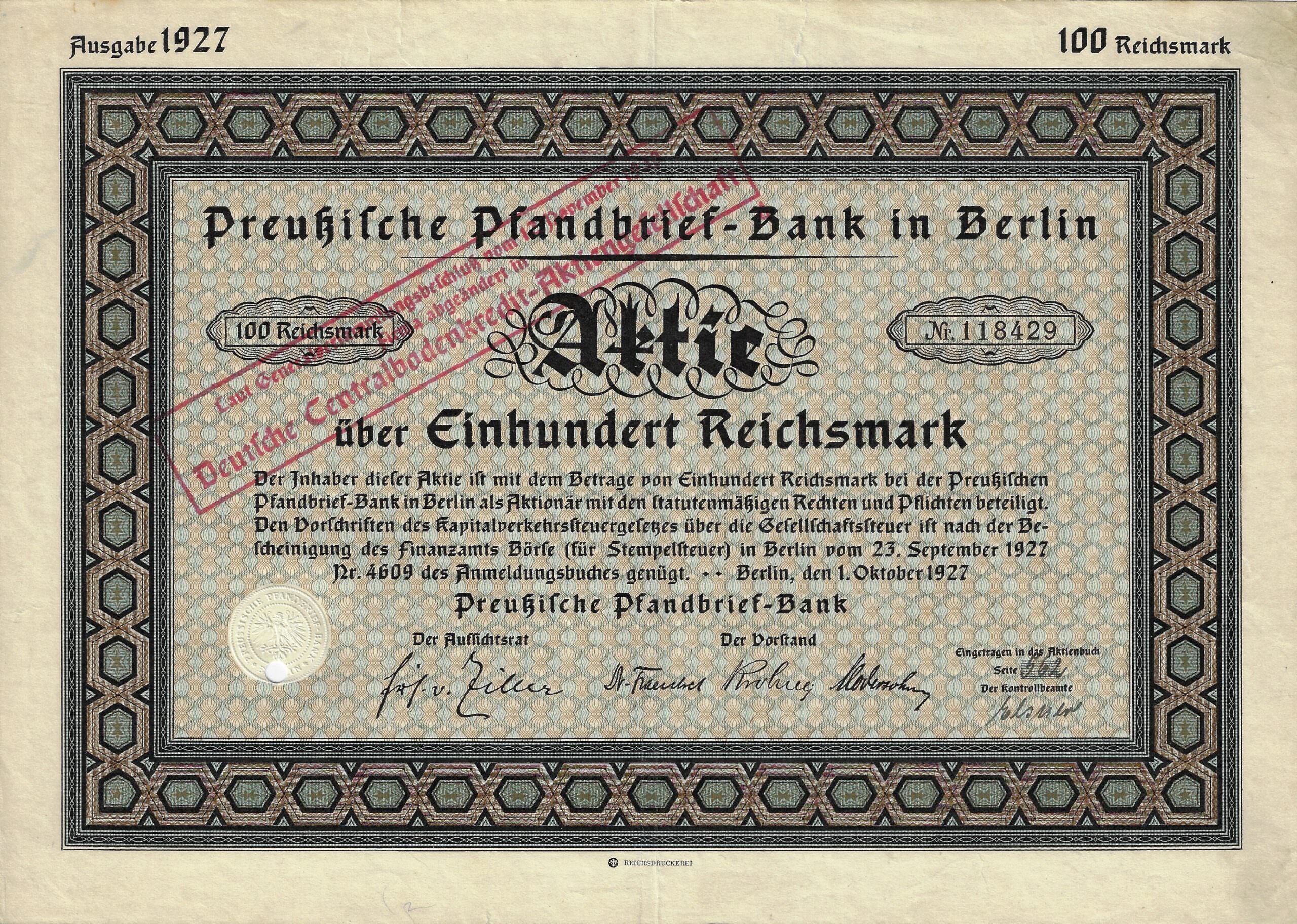 1930 fusioniert mit der Preußischen Central-Bodenkredit-AG zur Deutschen Centralbodenkredit-AG.