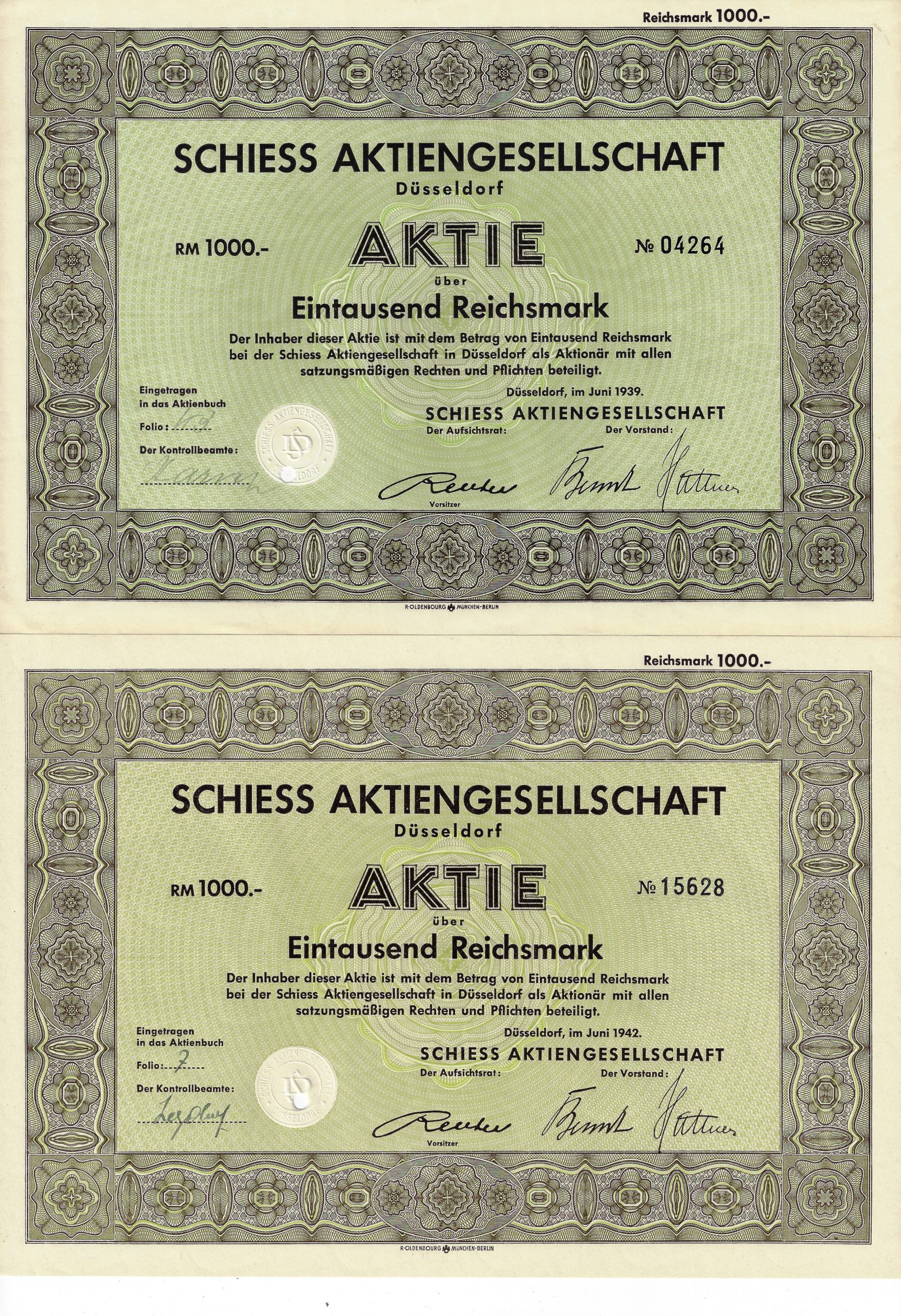 1921-1923 zur DEMAG gehörend, fusionierte Schiess 1925 mit der Werkzeugmaschinenfabrik Defrieswerke AG zur Schiess-Defries AG Maschinenfabrik und bekam somit auch Produktionsstätten im linksrheinischen Düsseldorf. Der Rüstungsbedarf des Dritten Reichs führte nach 1933 zum sprunghaften Ansteigen der Beschäftigungszahlen. Das Werk Heerdt wurde 1937 am alten Standort in ein Heerdter und ein Löricker Werk geteilt und erweitert. Das Oberbilker Werk expandierte im selben Jahr durch Grundstückszukauf. Ein weiteres Werk wurde im folgenden Jahr in Reisholz errichtet. Seit 1939 hieß das Unternehmen offiziell, nun alle Werke zusammenfassend, Schiess AG.