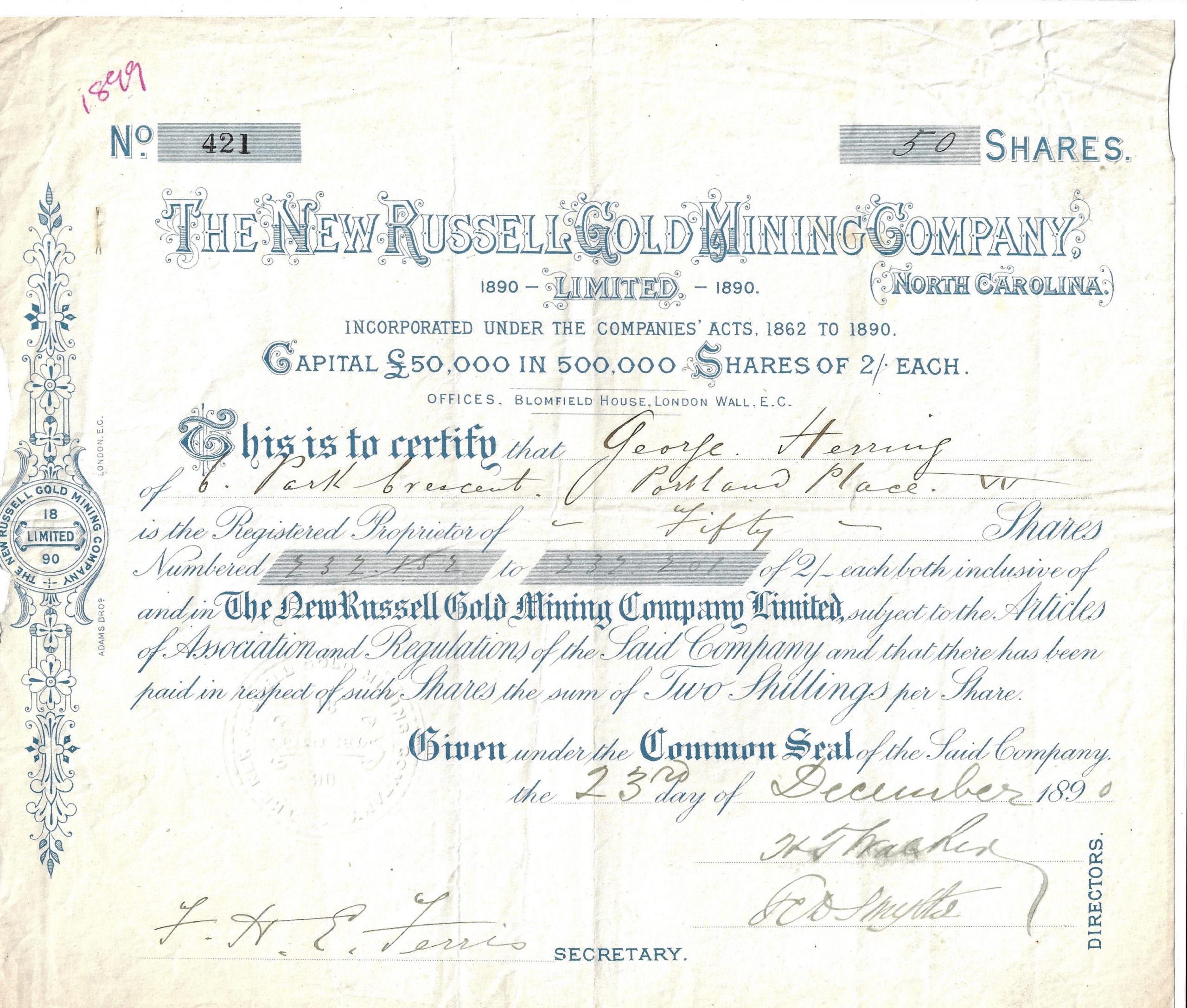 Zwischen 1880 und 1900 wurden insgesamt 23 Unternehmen registriert, die in London notierten und deren Geschäftstätigkeit sich auf das Minen- und Landgeschäft in North Carolina bezog.