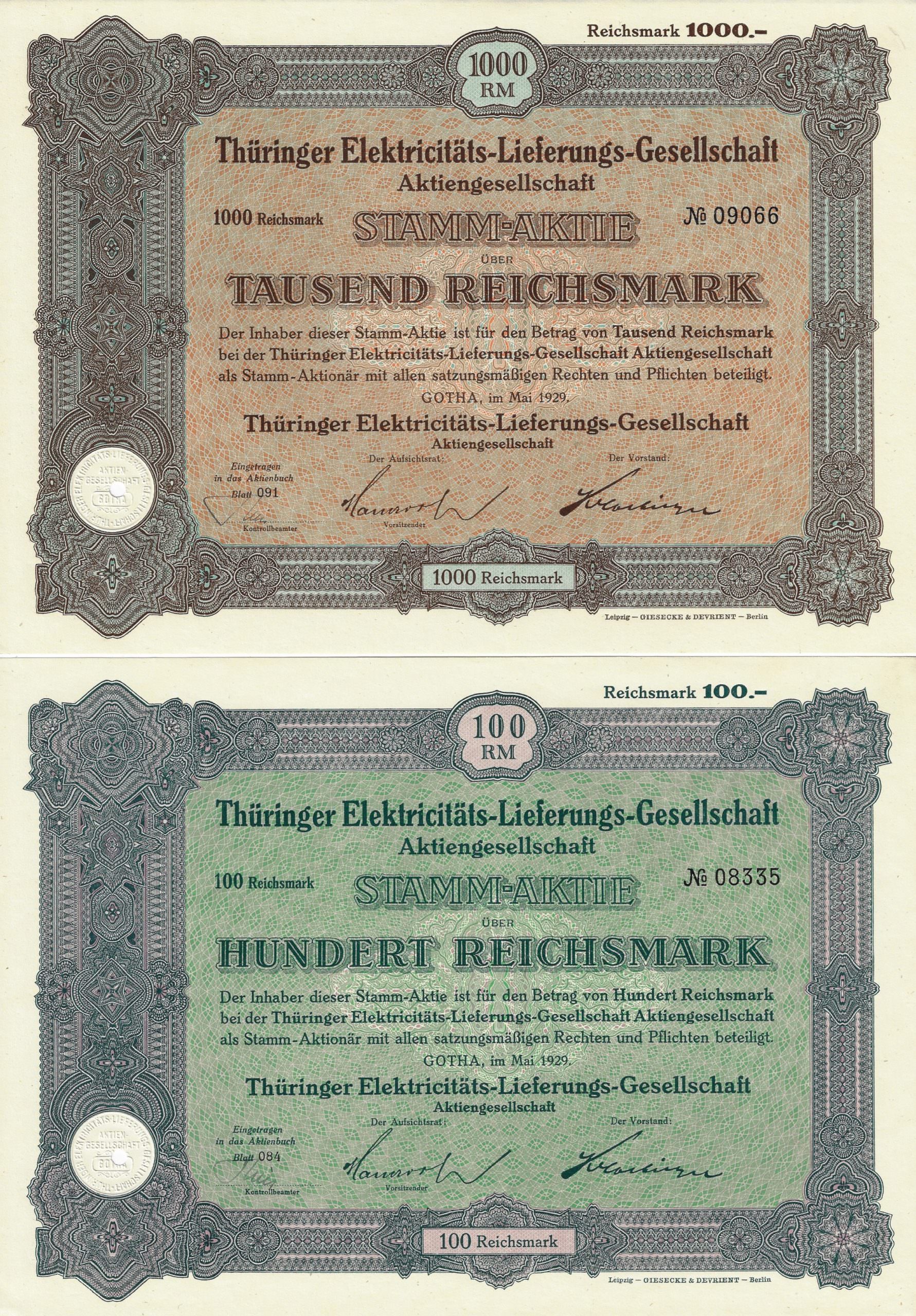 1912 im Zuge der Erweiterung zu einem Überlandunternehmen umbenannt in Thüringer Elektricitäts-Lieferungs-Gesellschaft AG.