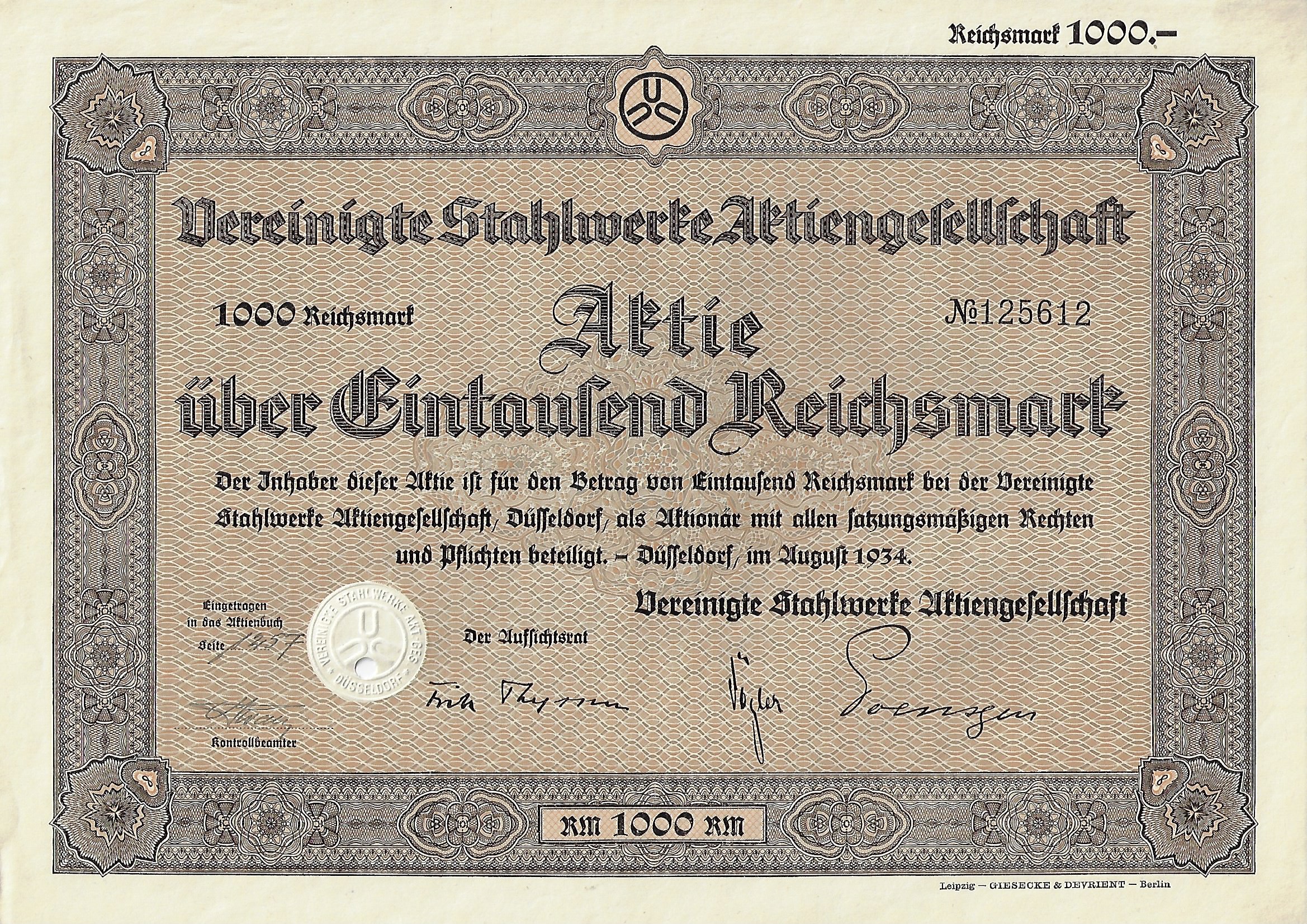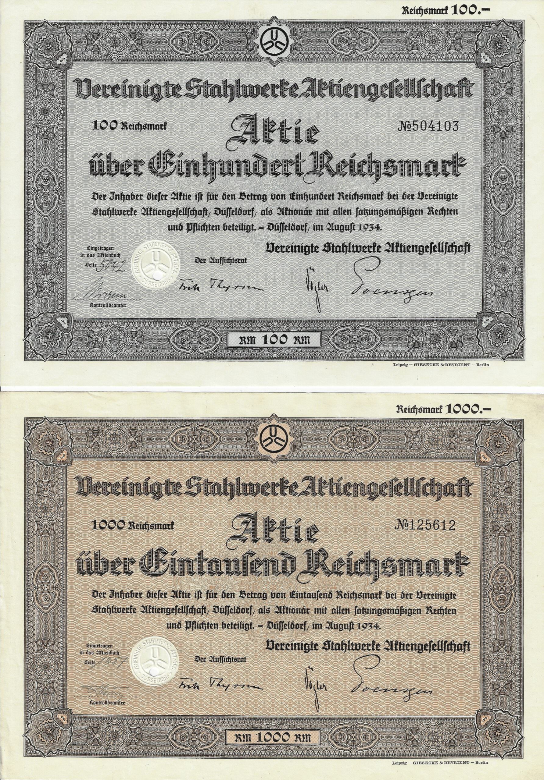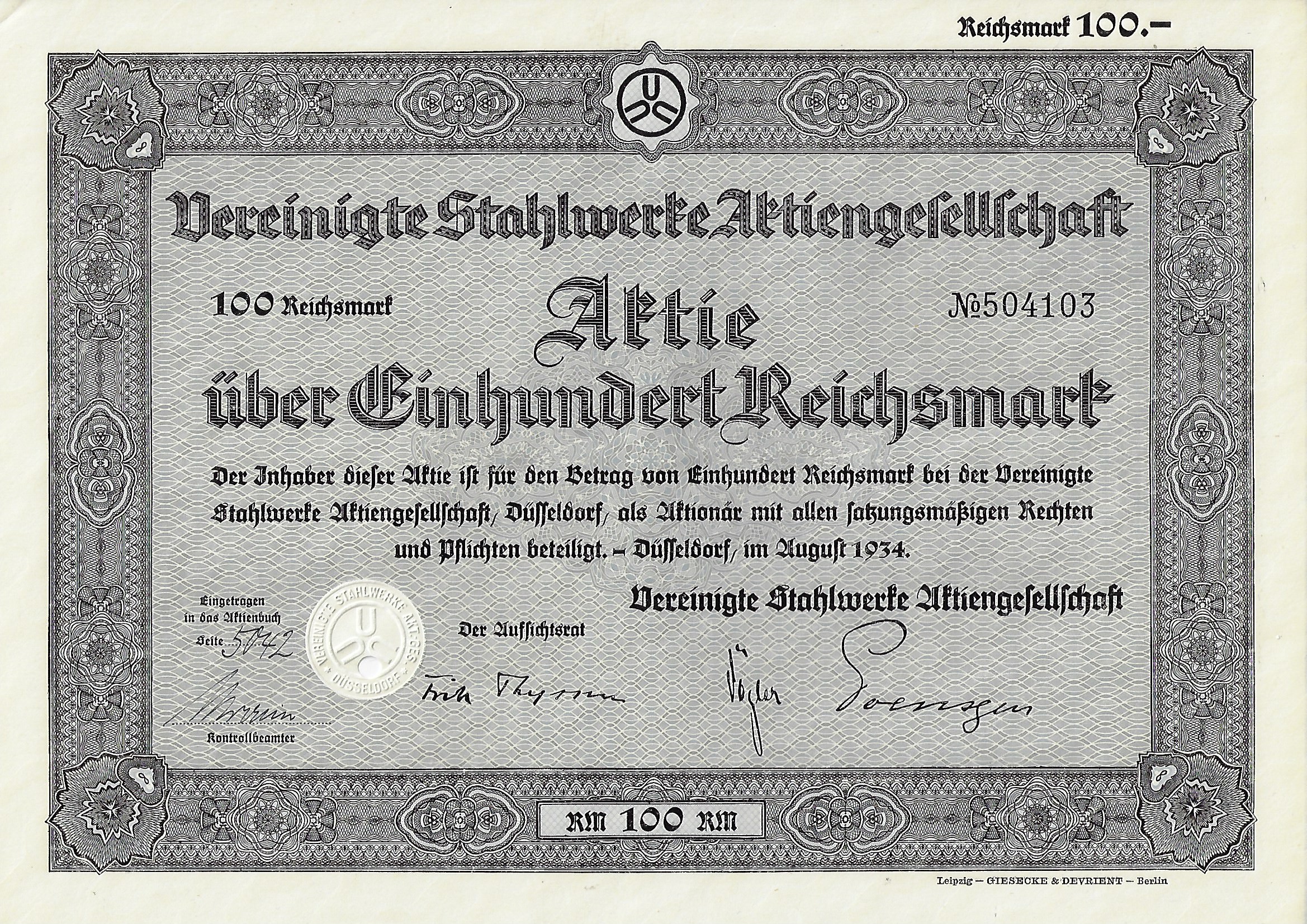1939 Nachdem Fritz Thyssen, bislang Großaktionär und Aufsichtsratsvorsitzender zu Beginn des Zweiten Weltkriegs im September 1939 zusammen mit seiner Familie in die Schweiz geflohen war, wurden seine Industriebeteiligungen sowie das Privatvermögen auf Anordnung Hermann Görings im Dezember gleichen Jahres vom Preußischen Staat beschlagnahmt