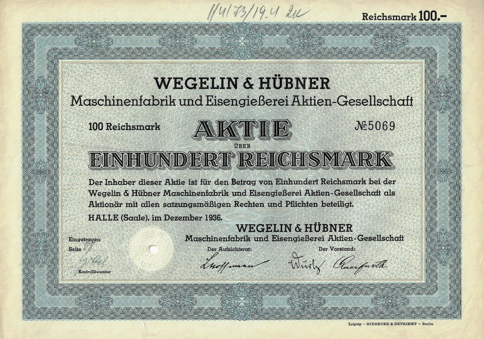 Ab 1901 firmierte die Fabrik als Wegelin & Hübner Maschinenfabrik und Eisengießerei AG Halle und bestand so bis zu ihrer Enteignung am 30. September 1946. Neuer Eigentümer wurde die Provinz Sachsen-Anhalt