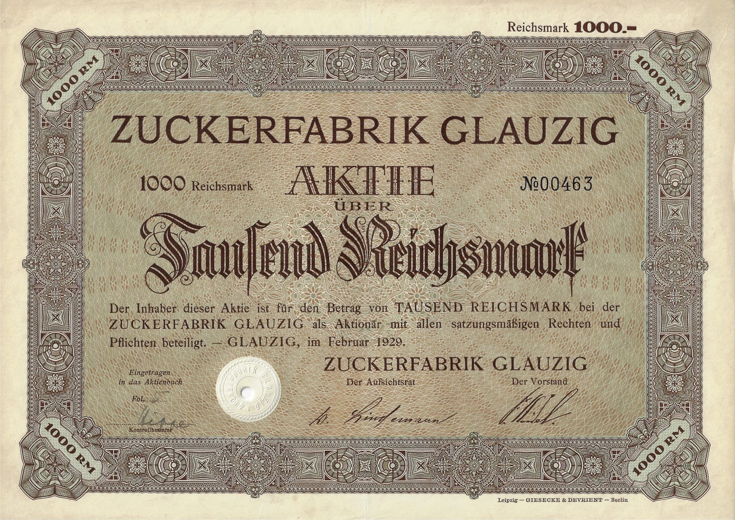 Gegründet: April 1872 (unter Übernahme der 1847 erbauten Rübenzuckerfabrik zu Glauzig)